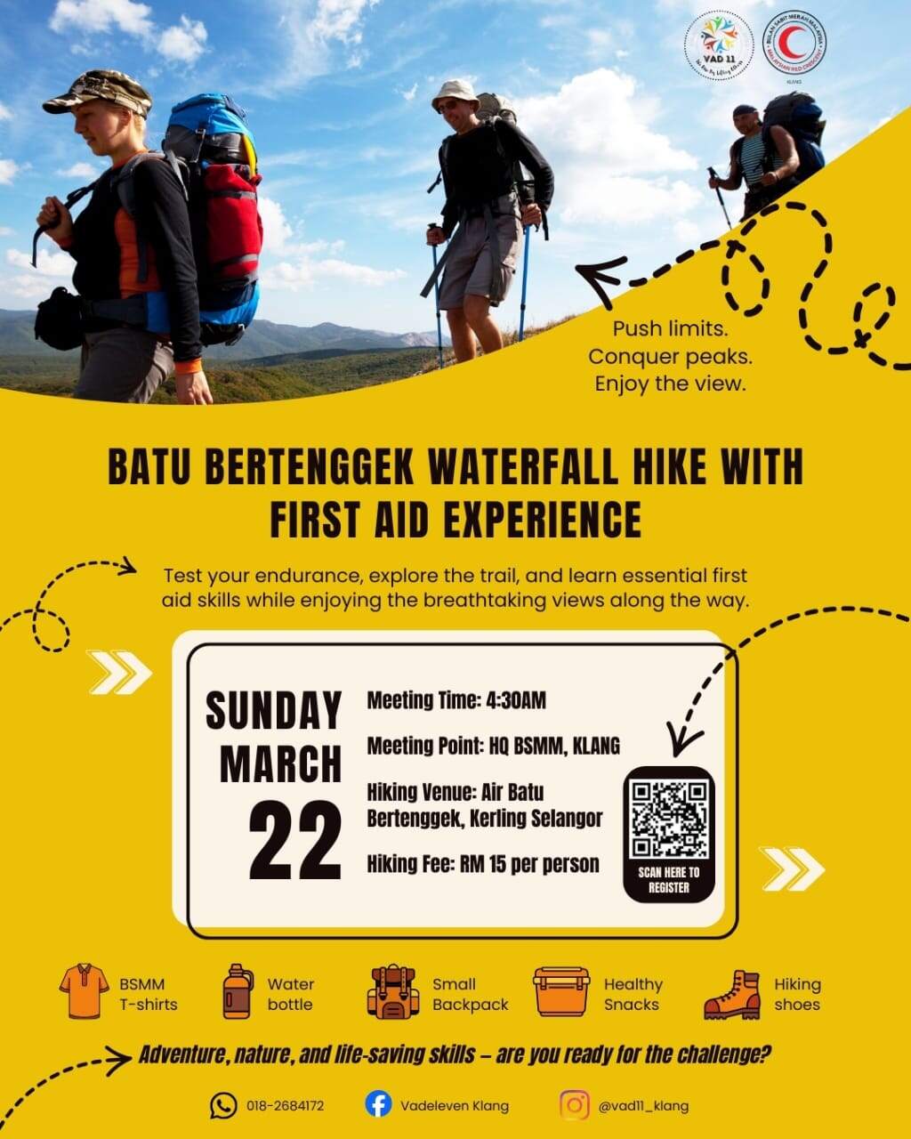 Sun, Mar 22, 2026, 04:30 AMBatu Bertenggek Waterfall Hike 2026 + First Aid Experience ? Hi everyone! ? Step out, explore, and level up your outdoor skills! Join us for the Batu Bertenggek Waterfall Hike, where adventure meets learning—we’ll also cover essential first aid skills along the trail. ? Date: 22/03/2026 (Sunday) ⏰ Time: 04:30 AM (Assembly at HQ BSMM, Klang) ? Location: Batu Bertenggek Waterfall, Kerling, Selangor ? Fee: RM 15 per person (Food provided ?) ? Attire: BSMM T-shirt + suitable hiking shoes/sandals ? Transport: Self-arranged (Carpooling encouraged) ? Register now by scanning the QR code and submit your headcount by 17 March 2026. Don’t miss out—let’s enjoy the trail, nature, and learn together! ? Only For BSMM Daerah KlangGGajeinthiran Al Pragash