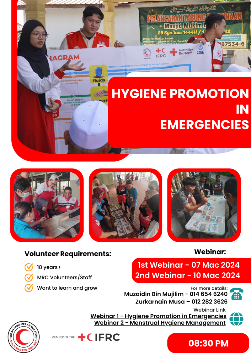 We are organizing a series of webinars on Hygiene Promotion in Emergencies. The 1st Webinar is on 07 MAC 2024: Hygiene Promotion in Emergencies and 2nd Webinar is 10 MAC 2024: Menstrual Hygiene Management. Both of the webinar session start at 8:30 pm until 09.30 pm. You can get the webinar's link from your state or you can contact Muzaidin, 014 654 6240.