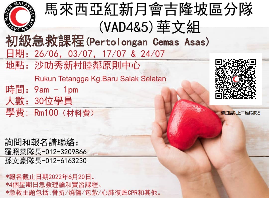 初级急救课程2022年(华文组) 当意外发生时,伤者情况危急,救护车还困在堵塞着的车龙中;而您却对急救法一窍不通、对伤者,也许是您心爱的人爱莫能助!有些伤者必须在四分钟之内抢救,否则极可能由活力充沛的人变成植物人,甚至回天乏术!想想看,那是多可怕的画面! 在救护人员抵达之前,我们如何协助伤者的伤势不进一步恶化?如何在四分钟之内替失去生命迹象的伤者施于心肺复苏法,让他“起死回生”? 这是以华语讲解的急救课程。四个星期日,上午九时至下午一时。别再犹豫了,学额只限30人,赶紧报名参加吧! 报名程序 1. 按以下链接报名 https://forms.gle/8TsqRze8AxnYRJ2i6 地点: https://goo.gl/maps/dXhy43JL63zzJKar6